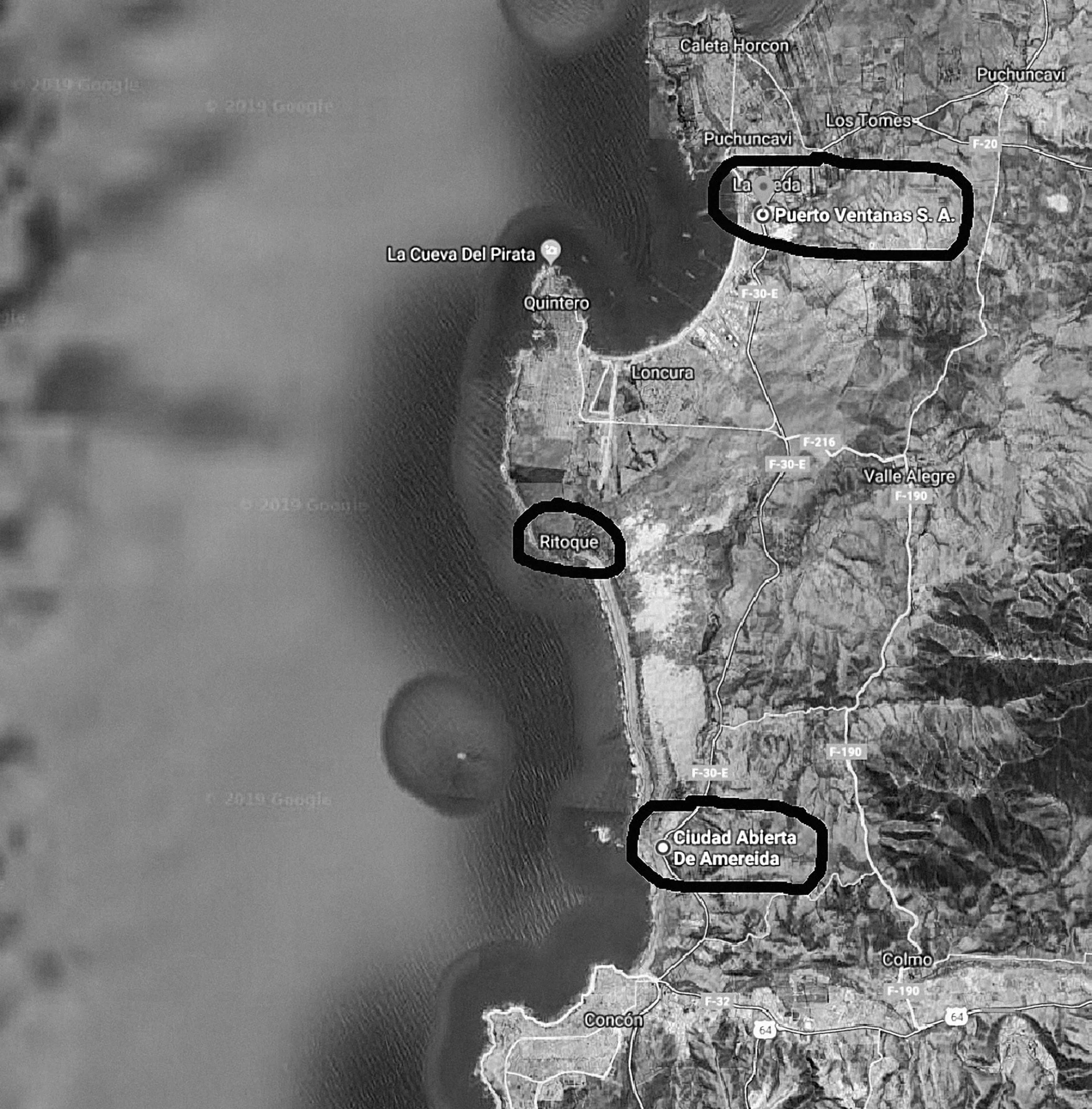 The project "De Ciudad Abierta a Ventanas" was conceived along 20km of a freight railroad that borders the Pacific Ocean until it reaches Quintero Bay, in the region of Valparaíso/Chile, between 2019 and 2022, at times when I was still residing there and then as a regular visitor.